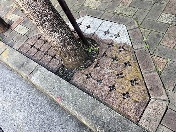 毎年7月の祭礼時には多くの人で溢れかえるフジサンロード。ここの街路樹の根本にはレンガを使って冨士さんがデザインされています。意外なことに、地元に住む方も気づいていないんですよ。